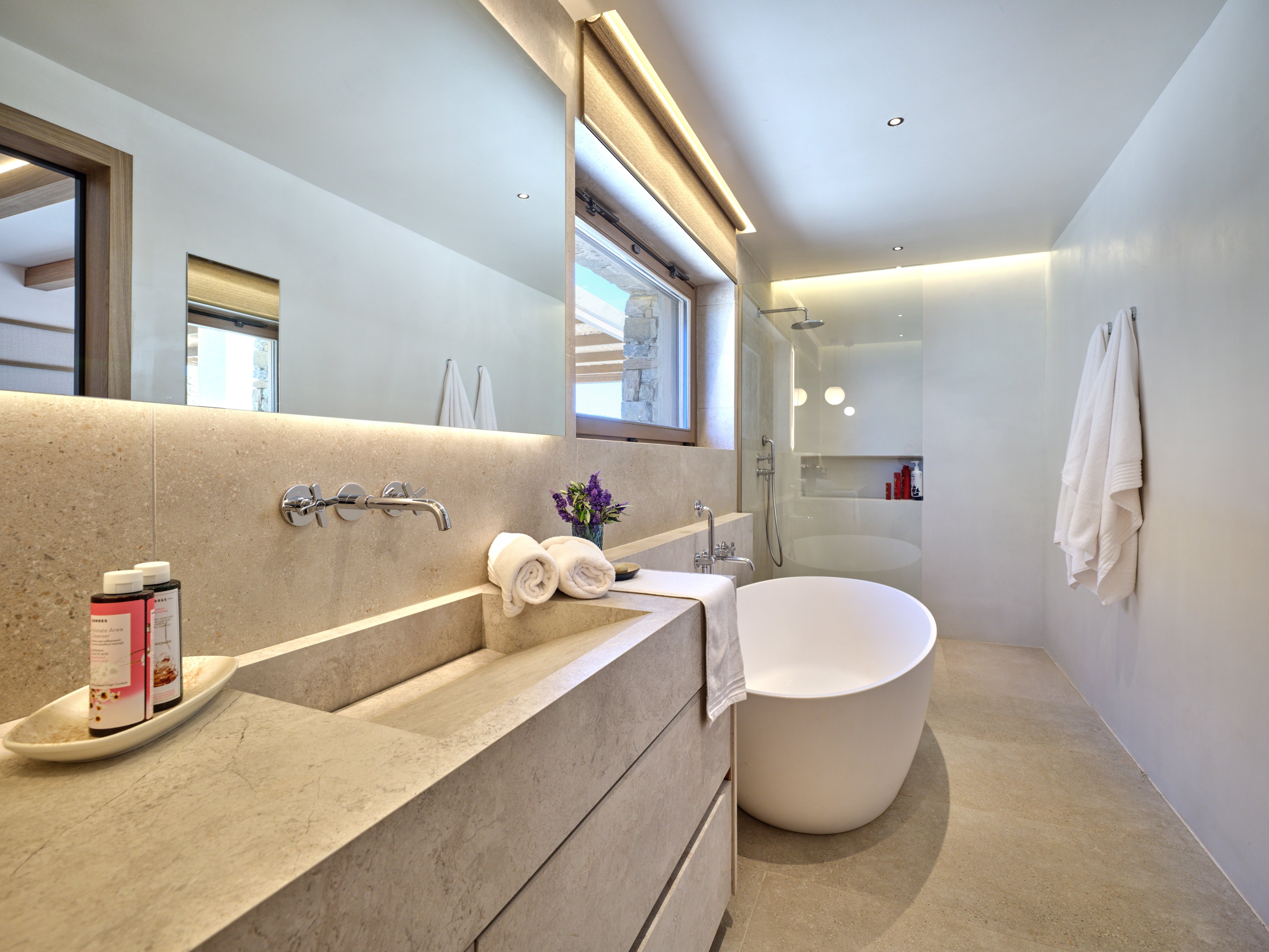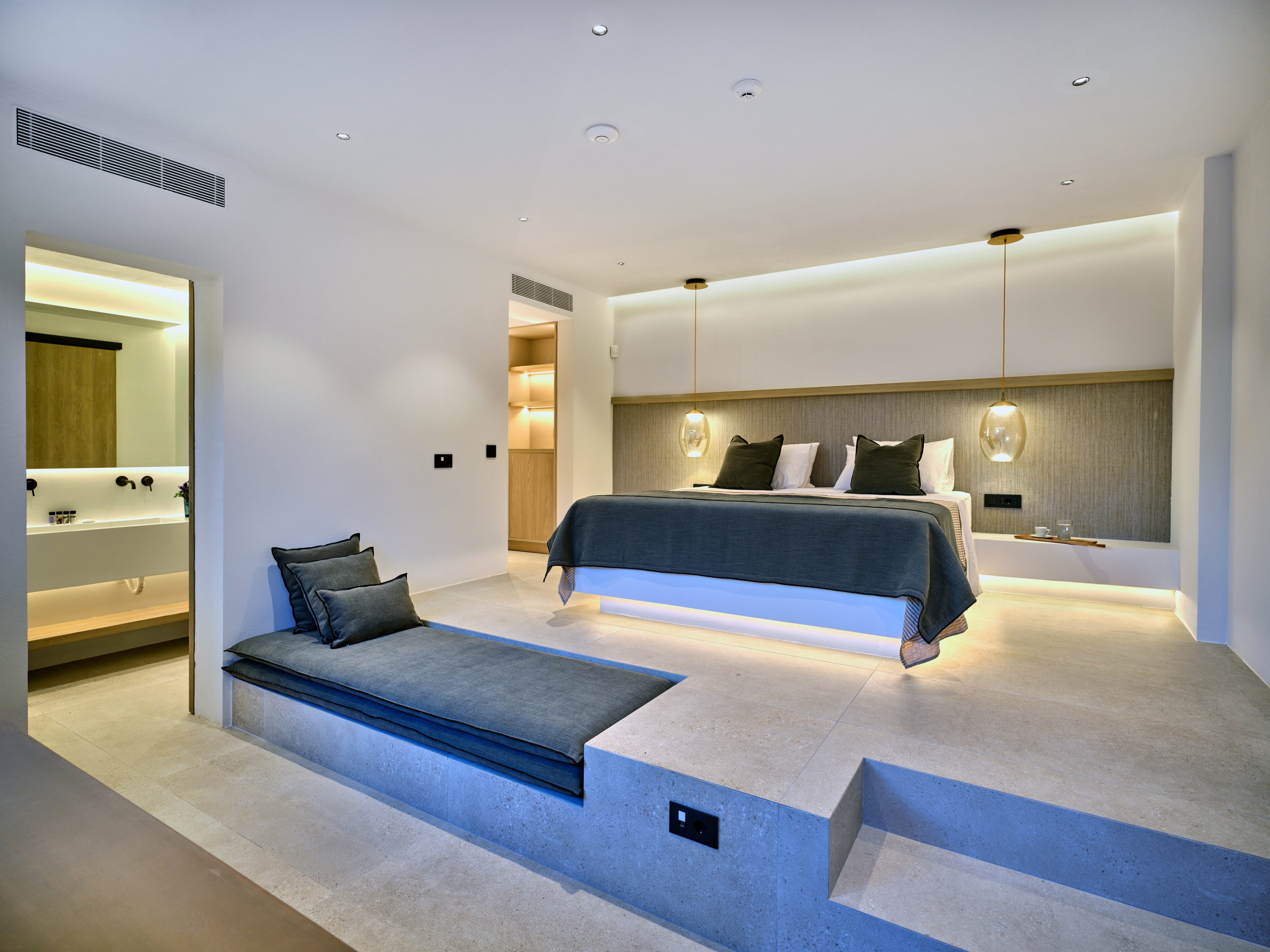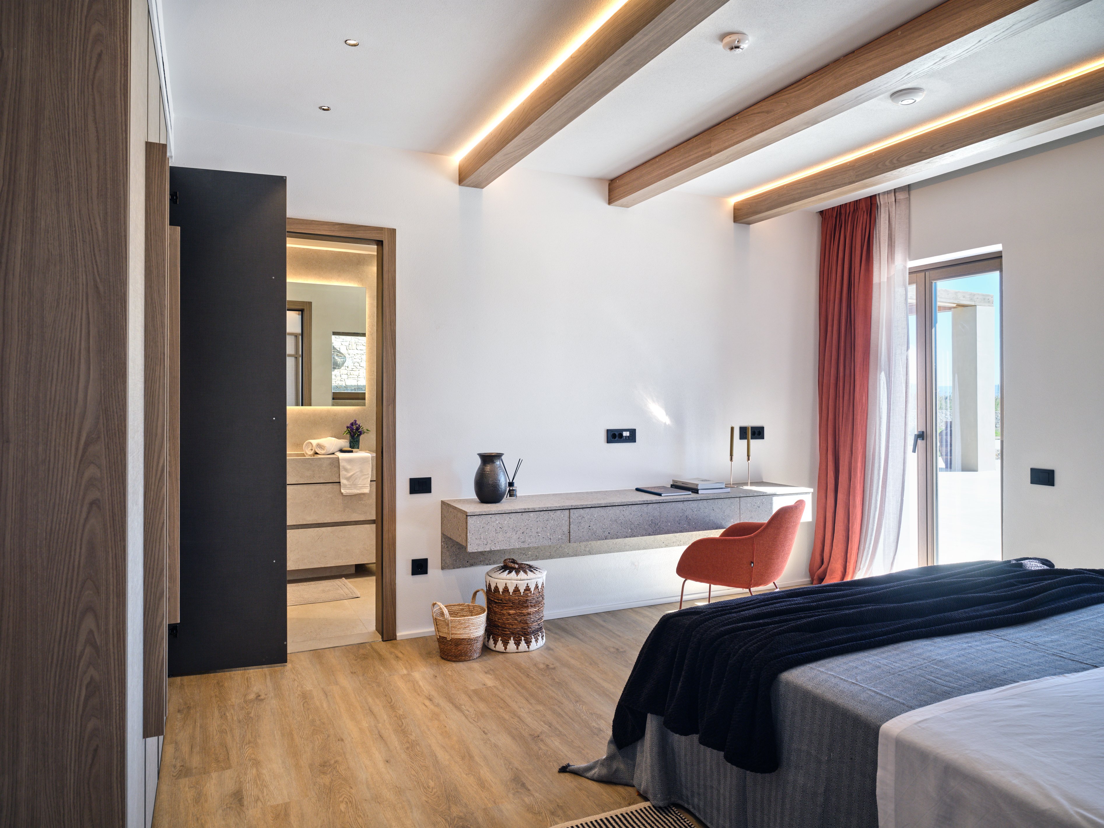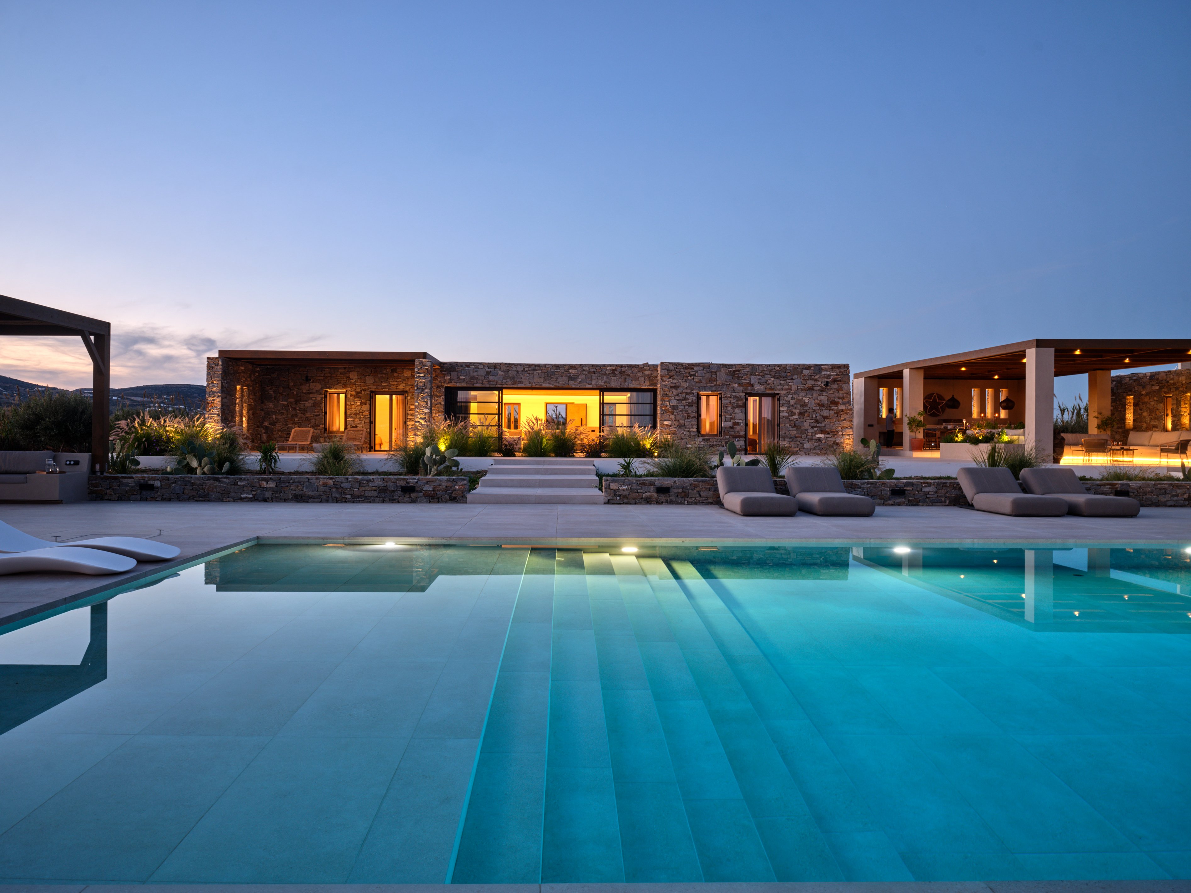 Contemporary interiors blend natural tones with modern amenities, while generous indoor and outdoor spaces create a relaxed yet refined atmosphere. At the heart of the villa, a large pool with an integrated firepit is surrounded by lounge areas, outdoor dining spaces and a bar—perfect for entertaining day to night.