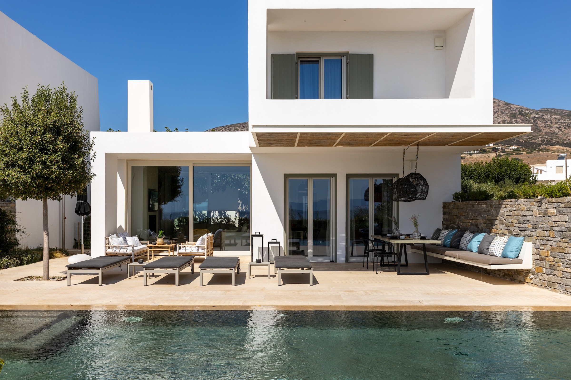 Villa Nima I is a luxurious retreat nestled in the peaceful area of Drios, Paros, offering breathtaking sea views and a relaxing atmosphere. The villa features four spacious bedrooms, each with an ensuite bathroom, including a master bedroom on the first floor with elevated views of the surroundings. The outdoor area is designed for relaxation and enjoyment, with a private swimming pool, comfortable seating, and a BBQ, perfect for outdoor dining. Ideal for families and other groups, Villa Nima I blends comfort, style, and convenience, making it an excellent choice for a memorable and serene getaway.