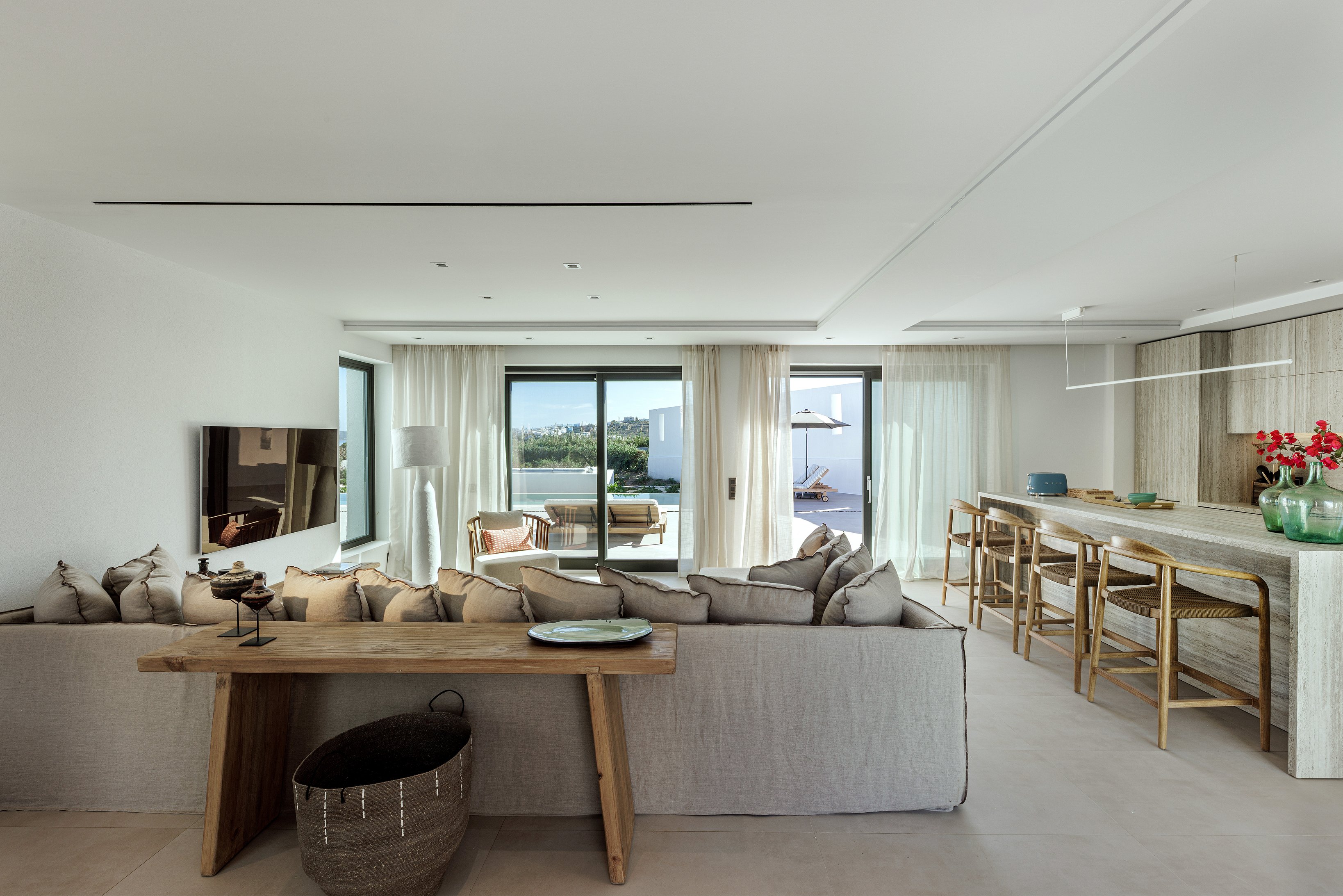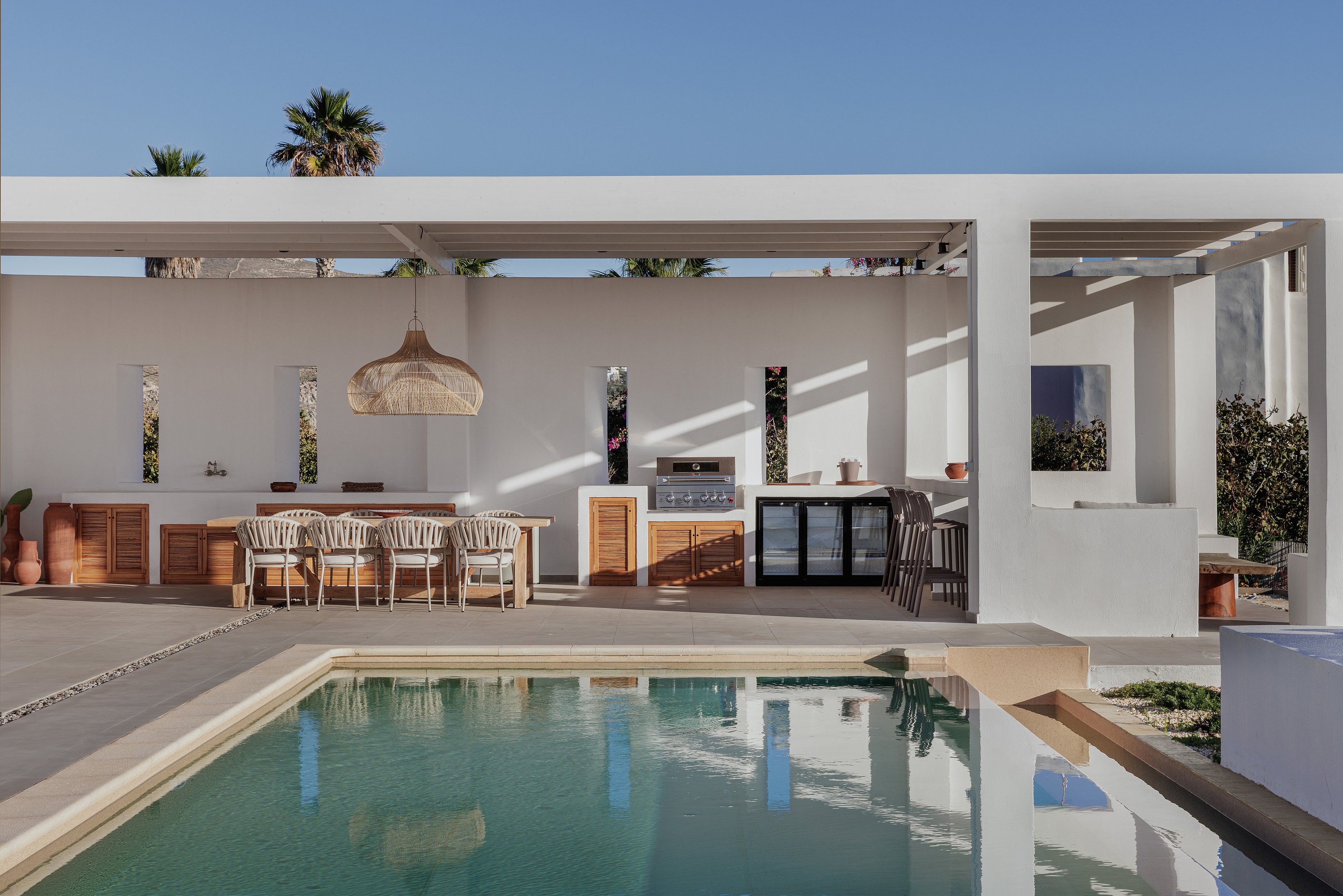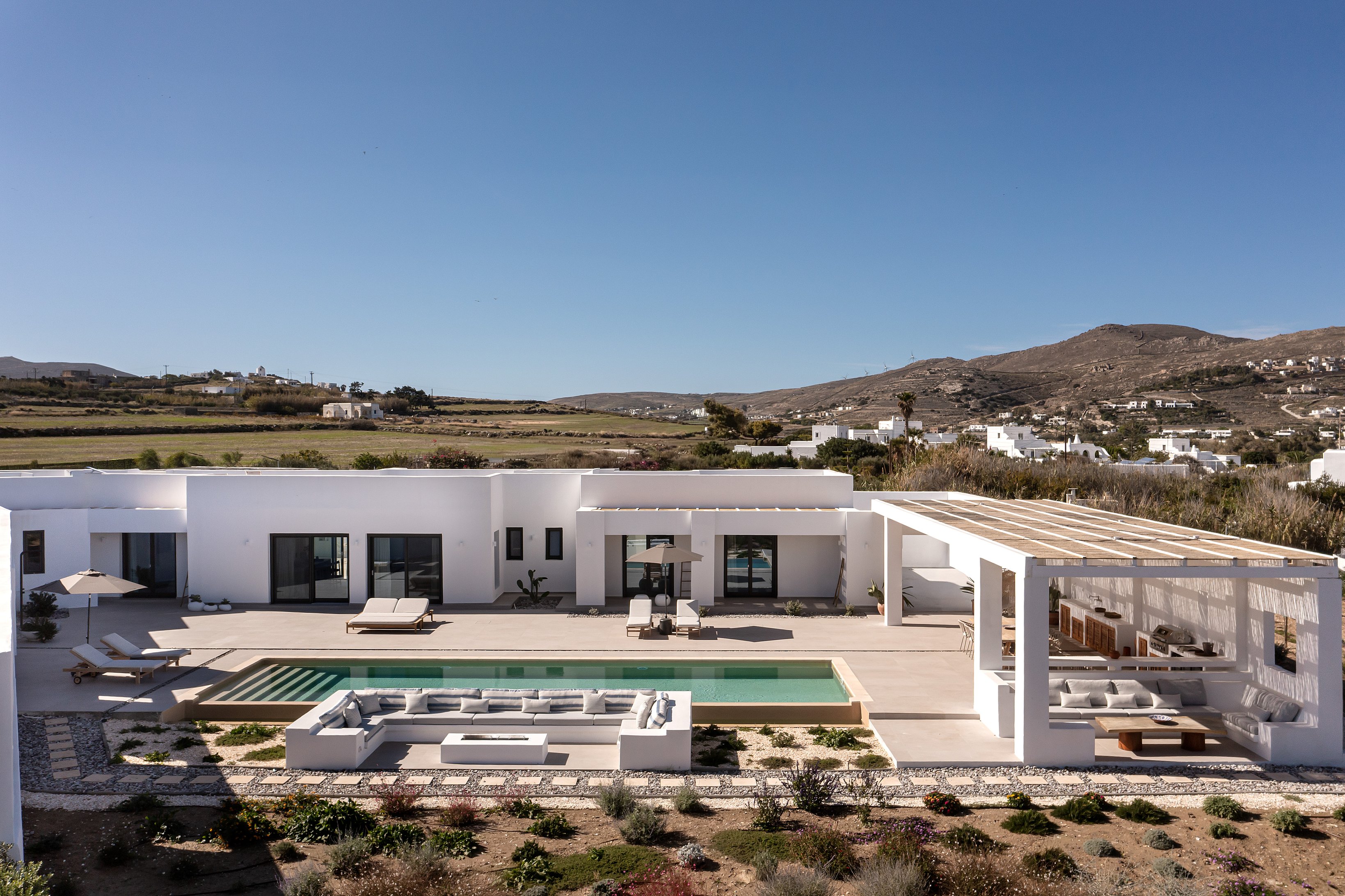 The villa features four stylish bedrooms (the fourth currently being furnished), a spacious open-plan living area, and a fully equipped kitchen for effortless convenience. Outdoor spaces include a private swimming pool, sunken lounge, poolside relaxation area, barbecue zone, and two shaded dining areas ideal for any meal. Combining privacy, sophistication, and premium amenities, Villa Petra provides an exceptional stay for discerning guests seeking the best of Paros.