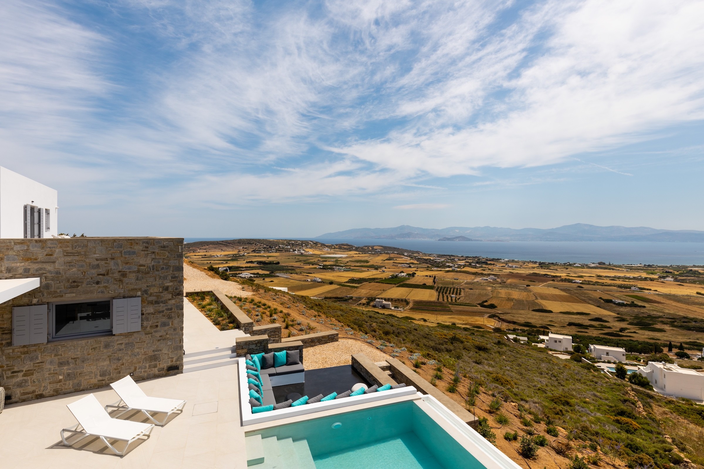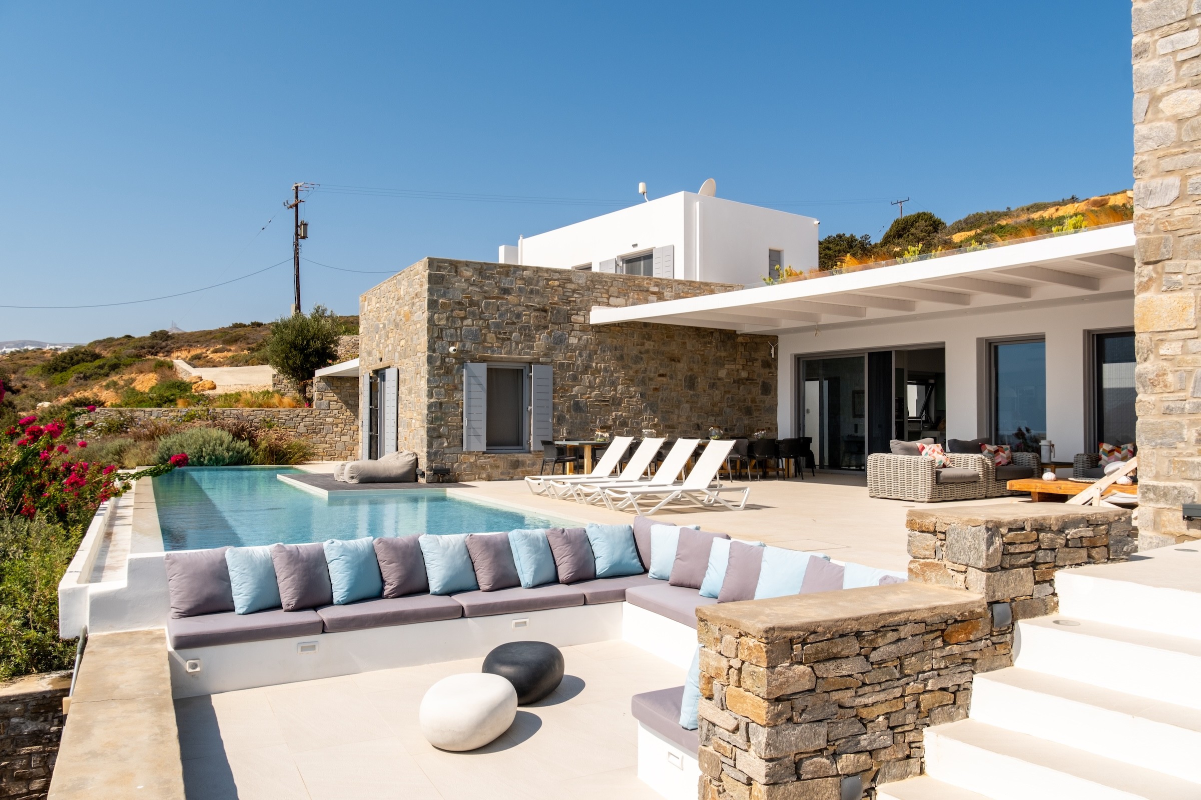 Villa Selinaia is perfect for a relaxing vacation, offering stunning panoramic views and complete privacy. The villa is located in the beautiful village of Kostos and features a 17m pool, spacious outdoor seating areas, a dining space, and a BBQ area. It has 5 bedrooms, an open-plan kitchen, living room, and a TV room/study that can be used as an additional bedroom. With private parking and seamless integration into the natural landscape, the villa ensures tranquility while being conveniently close to Naousa for those seeking nearby activities and entertainment.